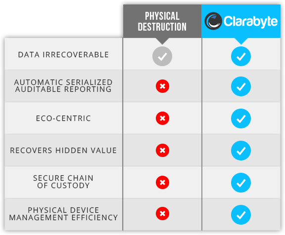 Using ClaraWipe is a fraction of the cost of physically destroying hard drives, and when combined with Clarabyte's resale tools, you can recover even more value for your bottom line. We will BEAT any existing solution not just on price, but also on quality, reliability,