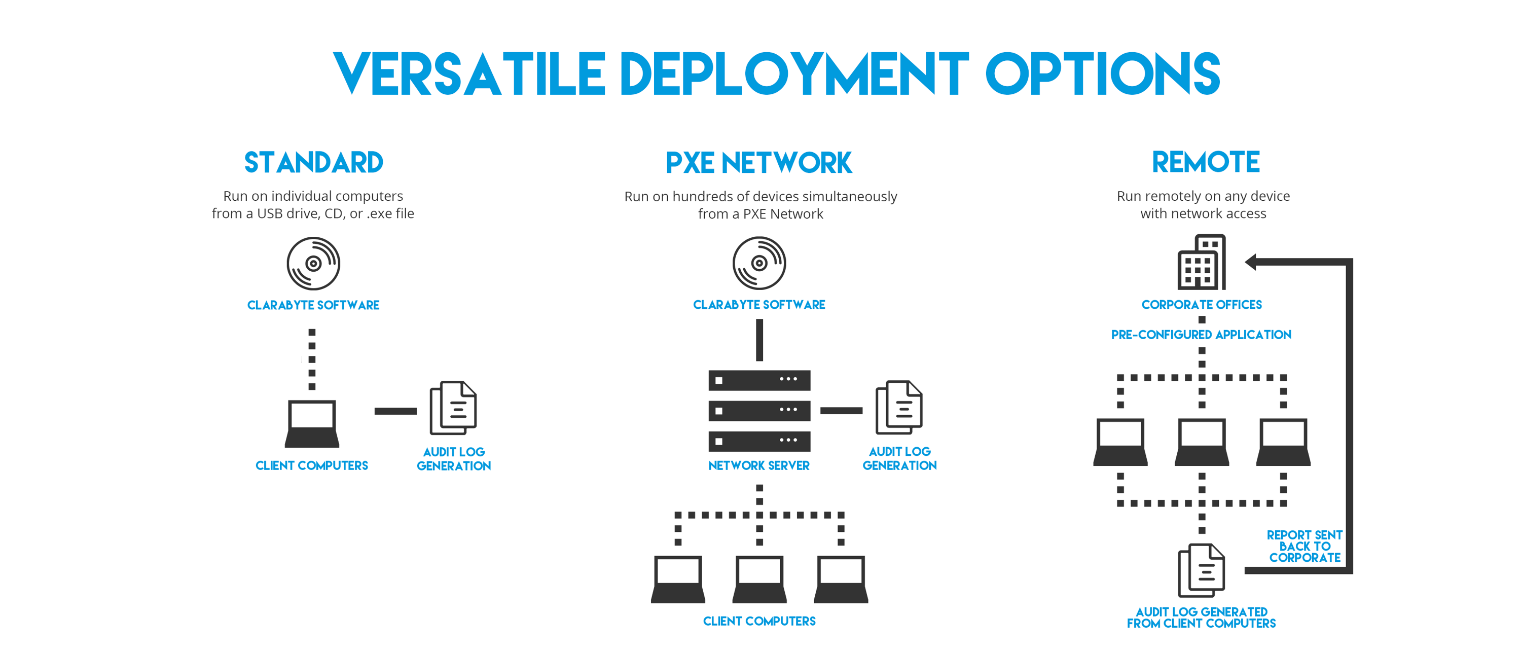 With ClaraWipe Enterprise, one block of licenses gives you the ability to wipe all of your devices, without the need for different products. ClaraWipe will wipe desktops, laptops, servers, RAID configurations, and other storage media.